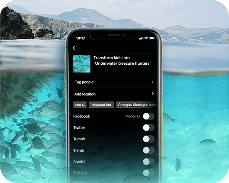 • With one-click sharing, post the stunning underwater scenes captured by your child to social media.